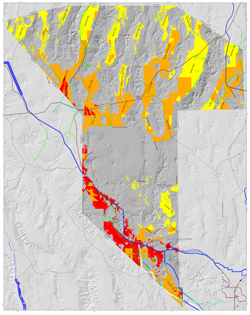 Solar resources in Nye County are among the best in the nation for both concentrating solar power (CSP) and photovoltaic (PV) systems. In March 2010 Nye County performed a Suitability Analysis for Nye County Solar Generation, Transmission, and Related Support Facilities. The suitability model included primary variables of solar resources, slope, and land exclusions (federally protected lands). Secondary variables included proximity to flood and seismic hazards, proximity to roads and power transmission corridors, visual resources and desert tortoise and sage grouse habitats. The analysis results were presented in a large format map, showing the locations of "good, better, and best" suitable lands in Nye County for solar development.